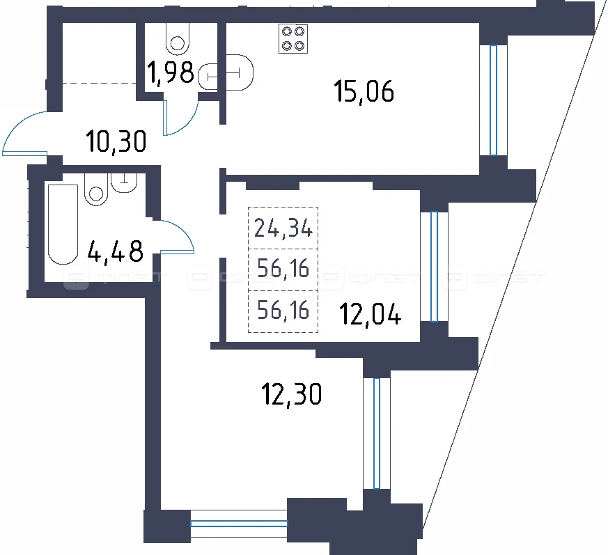 - 56.16/24.34/15.06 м²